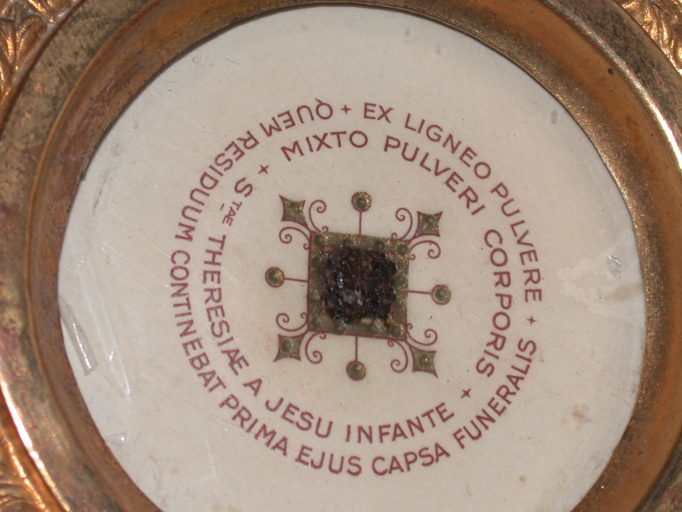 Reliquaire de sainte Thérèse de l´Enfant Jésus : métal : fondu, doré ; verre transparent (bleu, rouge) : taillé en cabochon ; 20 h. Oeuvre déposée. 1 ère moitié 20e siècle. Fig. 13, 14.
