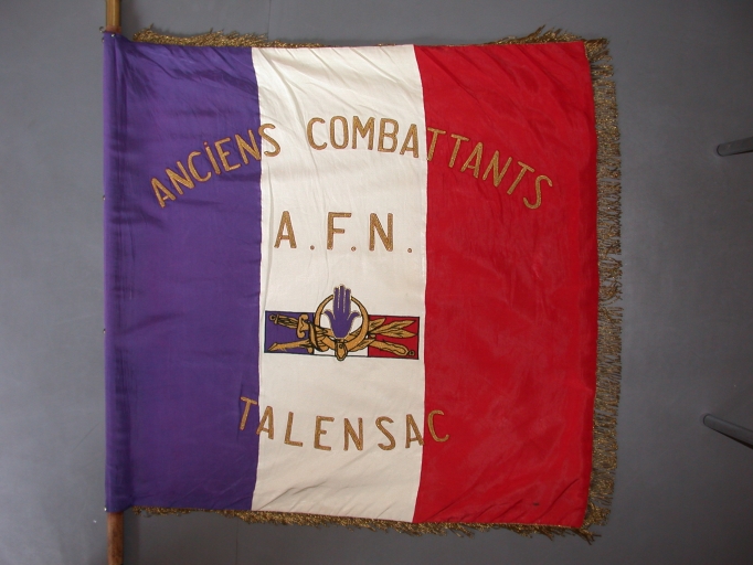 Drapeau des Anciens Combattants : soie : faille française, brodée, polychrome ; fil métal : doré ; 102,5 h. Inscription sur une face : COMBATTANTS / 1914 1918 / 1939 1945 / TALENSAC ; sur l'autre face : UNIS COMME AU FRONT. 2e moitié 20e siècle. Fig. 1