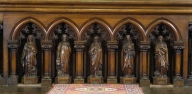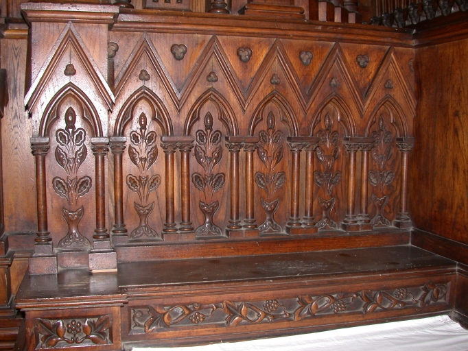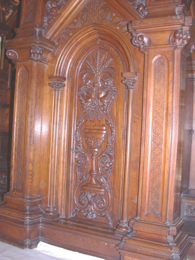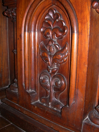 - chêne, mouluré, découpé, tourné, décor dans la masse, décor rapporté, décor en ronde bosse, décor en bas relief, gravé, vernis