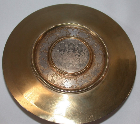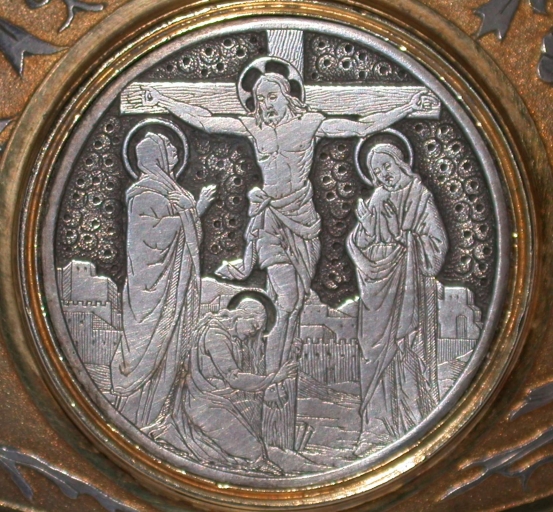 Les poinçons sont sur la patène, sur la coupe et le pied. Inscription sur la coupe : HIC EST ENIM SANGUINIS MEI. Sous le pied, sur une plaque, marque en creux : Mon ROUXEL-LE-DAIN / BETIN FRES SUCrs / RENNES. Dans la boîte, marque imprimée en doré sur une étiquette : ORNEMENTS d'EGLISE / BRONZES / ORFEVRERIE / 3 RUE MOTTE-FABLET RENNES / Mon ROUXEL-LEDAIN / BETIN Frères Succrs / DIPLÔME D´HONNEUR / RENNES 1887 / FABRIQUE DE / BRODERIE.