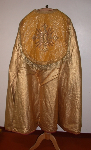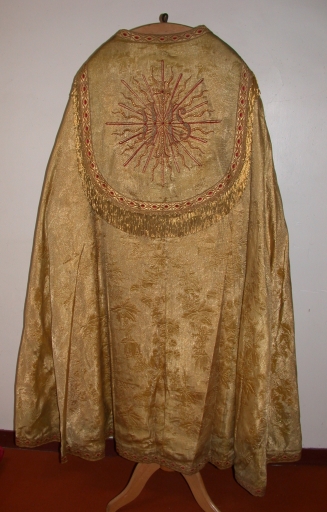 Chape dorée 2 : soie (jaune) : drap d´or, application sur textile, adjonction d´éléments ; fil métal : doré. Oeuvre déposée ; le chaperon et les orfrois sont anciens ; traces de moisissures. Limite 19e siècle 20e siècle. Représentation : I.H.S. ; rayons ; croix fleuronnée. Fig. 23.