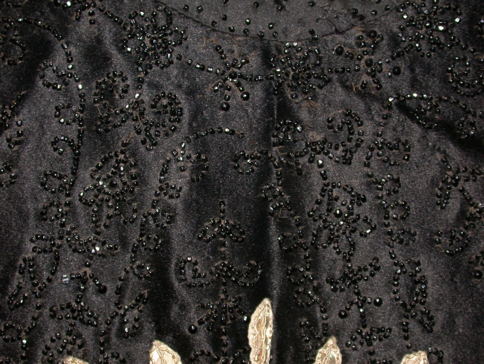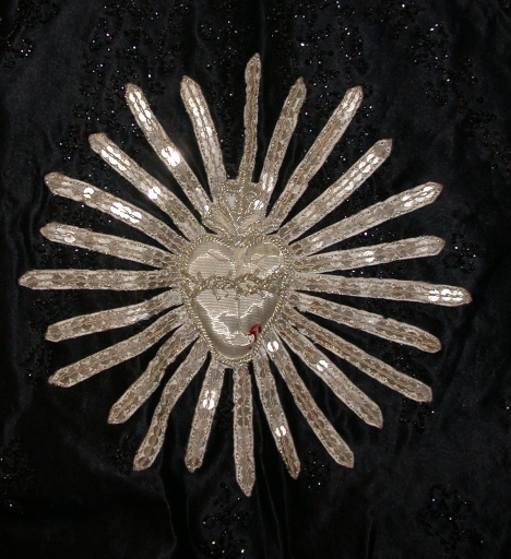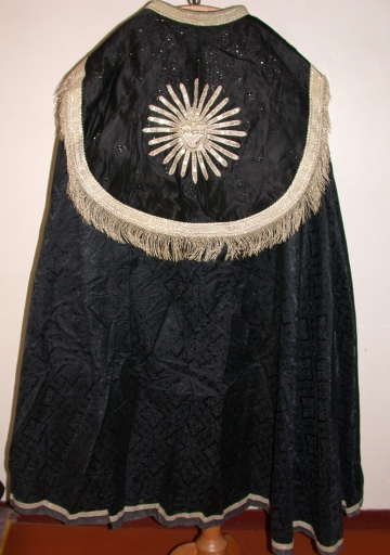 Chape noire : soie (noire) : tissu façonné, application sur textile ; soie (noire) : satin, application sur textile, adjonction d´éléments ; perles de verre : cousues. Oeuvre déposée. Le chaperon semble provenir d´un vêtement laïque sur lequel on a posé le décor de coeur rayonnant. Limite 19e siècle 20e siècle. Représentation : coeur rayonnant. Fig. 25, 26, 27.