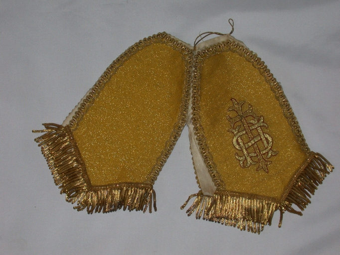 Voile huméral : soie (blanche) (?) : gros de Tours, application sur textile, adjonction d´éléments ; fil métal : doré. Oeuvre déposée. 1er quart 20e siècle. Fig. 32.