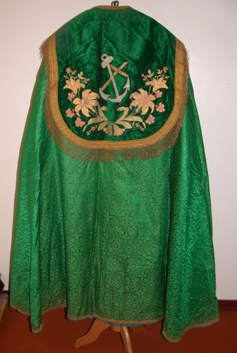Chape verte 1 : soie (verte) : tissu façonné, application sur textile ; soie (verte) : velours uni ; fil métal : argenté. Oeuvre déposée ; le décor brodé a été recousu sur un fond de velours puis peint. Limite 19e siècle 20e siècle. Représentation : croix, ancre, ornementation végétale. Fig. 29.