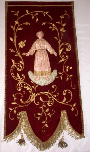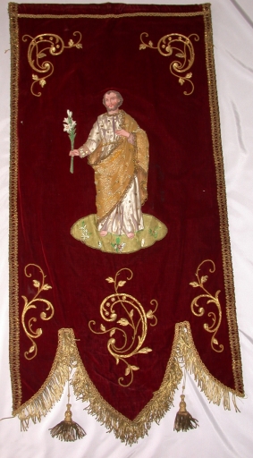 Bannière de procession : Enfant Jésus-saint Joseph : soie (rouge) : velours uni, application sur textile, adjonction d´éléments ; textile (support) : peint polychrome ; Fil métal : doré Oeuvre déposée ; traces de moisissures. 4e quart 19e siècle. Fig. 15, 16.