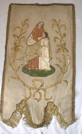 Bannière de procession : Immaculée Conception-Education de la Vierge : soie (blanche) : tissu façonné, application sur textile, adjonction d´éléments ; textile (support) : peint polychrome ; Fil métal : doré. Oeuvre déposée ; traces de moisissures. Les applications sont usées. 4e quart 19e siècle. Fig. 13, 14.