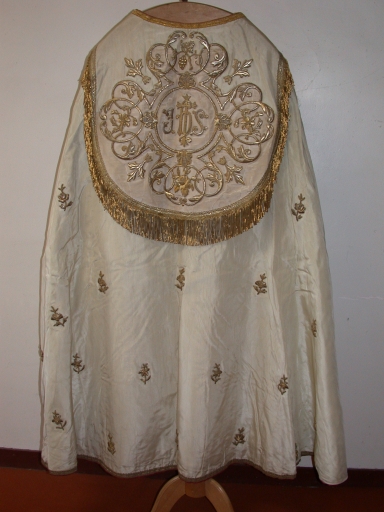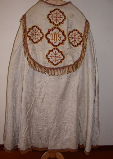 Chape blanche 1 : soie (blanche) : tissu façonné, application sur textile, tapisserie au point, polychrome. Oeuvre déposée ; le tissu est usé. Limite 19e siècle 20e siècle. Représentation : I.H.S. ; croix. Fig. 20.
