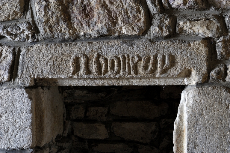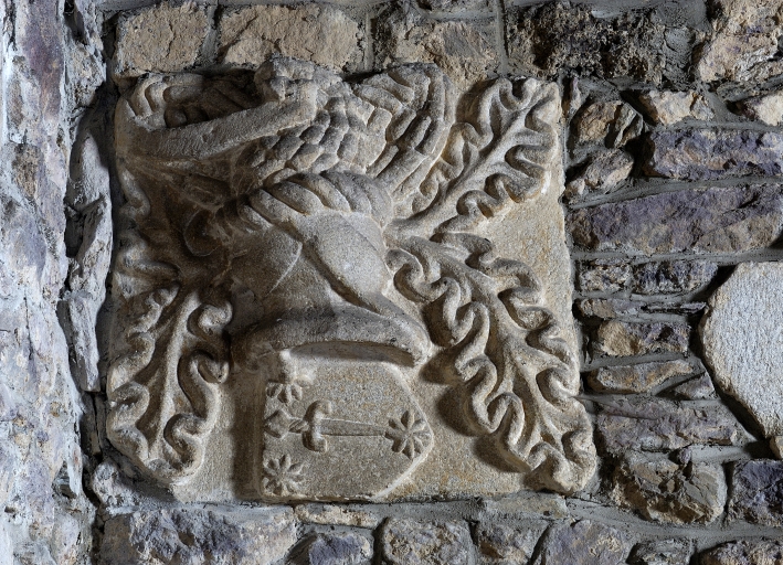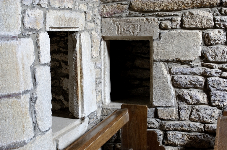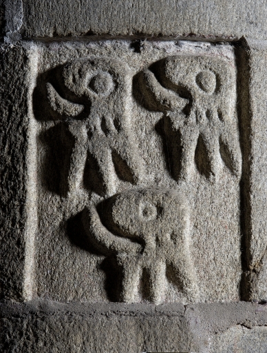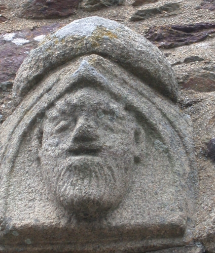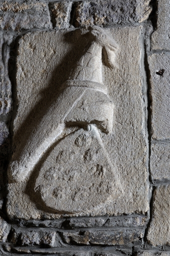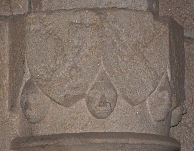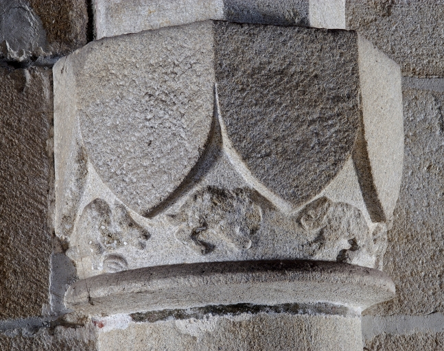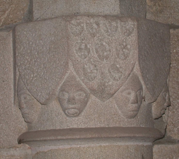 Inscriptions en relief sur les linteaux des niches crédences. Armoiries de la famille du Cahideuc sur les colonnes 1 et 2 nord : de gueules à trois têtes de léopard d'or lampassés de gueules. Heaume portant un cygne qui tient un phylactère dans son bec, posé au-dessus d'un écu : de (?) à l'épée de (?) accompagnée de trois molettes. Heaume portant une tête de bouc, posé au-dessus d'un écu : de (?) papelonné (?) . Les chapiteaux à masques d'hommes de la chapelle sud portent des écus : de (?) à la croix de Saint-André de (?) ; mi-parti de (?) à la croix de Saint-André de (?) et de (?) à six macles de (?) ; de (?) papelonné (?) . Plusieurs écus sont lisses.