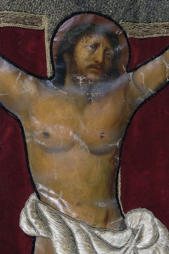 La couleur du velours bleu a beaucoup foncé ; le galon inférieur est décousu. Les boules de la hampe ont été repeintes en doré. Quelques éclats dans la peinture des chairs.
