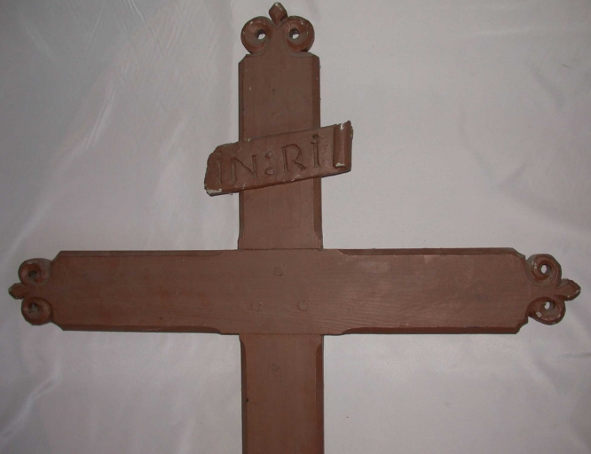 La croix est déposée ; le titulus est abîmé : traces d'insectes, un fragment a disparu..