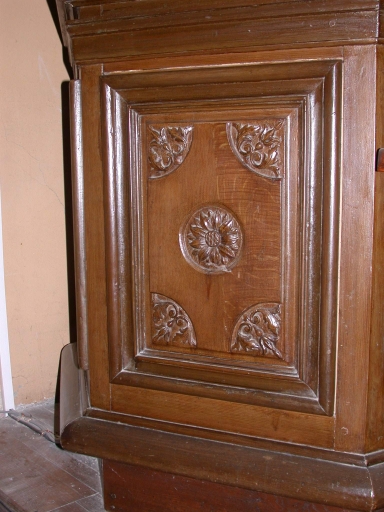 Chaire à précher datable de la fin du 17e siècle ou du début du 18e siècle. Le pied sert actuellement de soutien à la statue de sainte Thérèse.