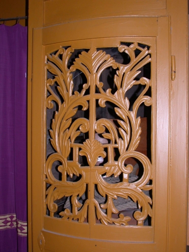 - bois, mouluré, découpé, décor dans la masse, décor en bas relief, peint