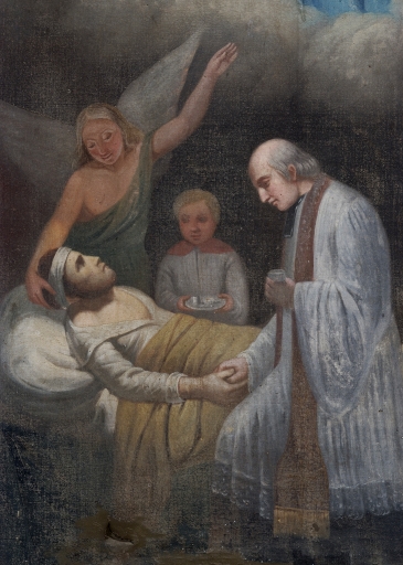 Ce tableau d'autel représentant la Bonne mort a été commandé probablement par la confrérie des Agonisants installée à Brécé depuis 1714. Les baies de la chapelle sud sont ouvertes en 1769. Le tableau a pu être réalisé à cette période.