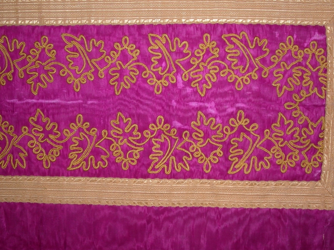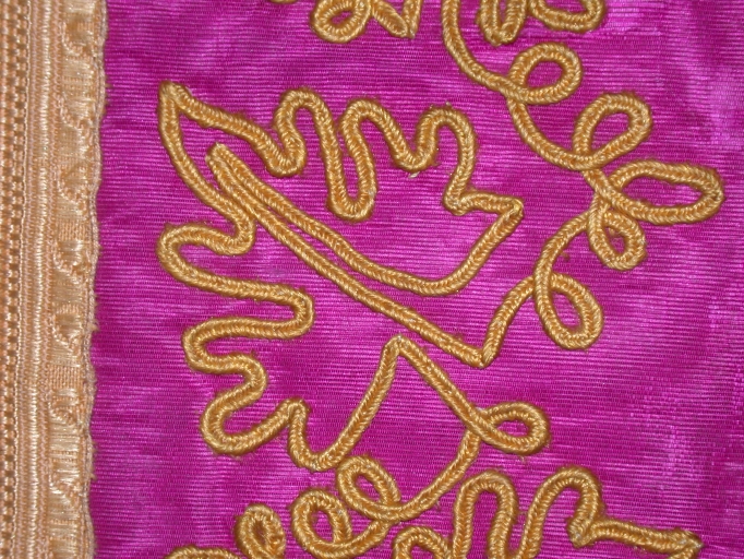 - PIOBJT La chasuble violette, de grande sobriété, est datable de la 2e moitié du 18e siècle. Remarquable par le travail de couture. Le galon est appliqué à la main et forme un dessin de frise de feuilles d'une grande précision.