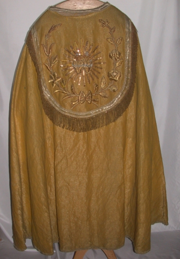 Ornement doré : chasuble, bourse de corporal, voile de calice : soie (jaune) : drap d´or, application sur textile, adjonction d´éléments ; fil : métal doré. Oeuvre déposée ; il manque l´étole et le manipule. 1er quart 20e siècle. Représentation : I.H.S. ; ornementation végétale ; rayons. Fig. 26.