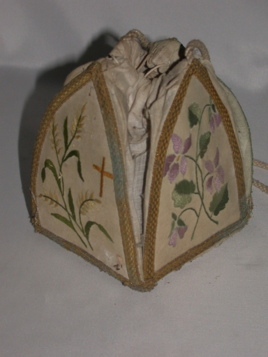 Bourse du saint sacrement : soie (blanche) : satin, brodé, polychrome, application sur textile ; fil : métal doré ; 12 h. Oeuvre déposée. 1er quart 20e siècle. Représentation : ornementation végétale ; croix. Fig. 16.