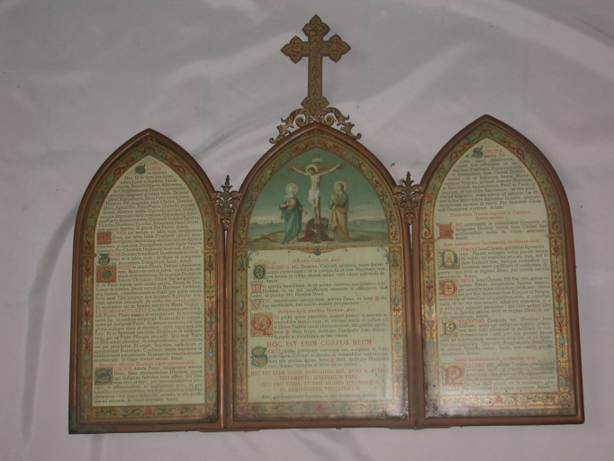 Canon d´autel : papier : imprimé, polychrome ; métal : fondu, doré ; 44 h. Oeuvre déposée. Représentation : Crucifixion. Fig. 5.