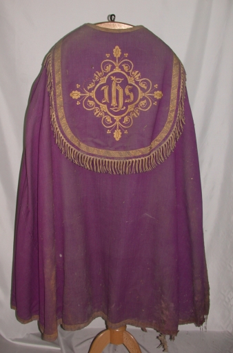 Chape 9 : soie (violette) : tissu façonné, brodé, velours uni, application sur textile, adjonction d´éléments. Oeuvre déposée. Limite 19e siècle 20e siècle. Représentation : I.H.S ; ornementation végétale. Fig. 25.