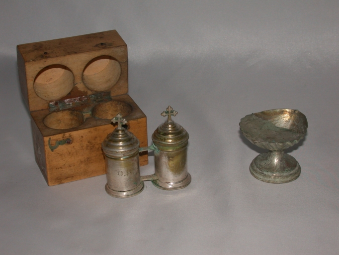 Ampoules à huiles saintes : métal : fondu, argenté ; 8 h. 19e siècle. Fig. 11.