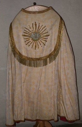 Chape 2 et Voile huméral : soie (blanche, jaune) : tissu façonné, application sur textile, adjonction d´éléments ; fil métal : doré, argenté. Oeuvre déposée ; le tissu est en partie usé. Limite 19e siècle 20e siècle. Représentation : pélican mystique ; rayons. Fig. 11 et 12.