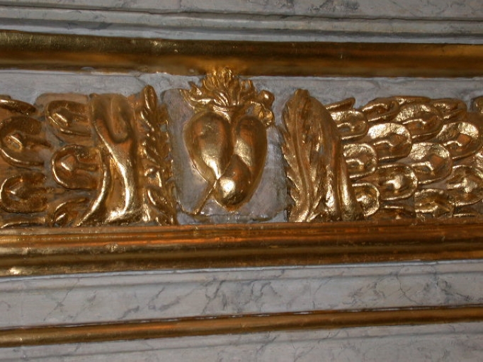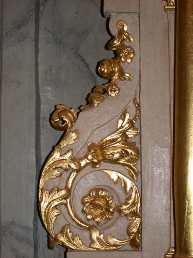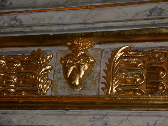 - calcaire, mouluré, tourné, décor dans la masse, décor en haut relief, peint, faux marbre, doré