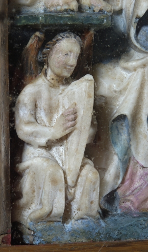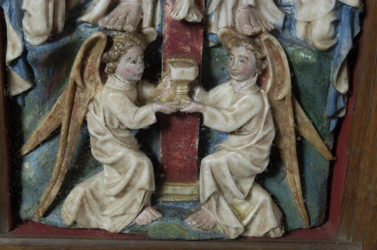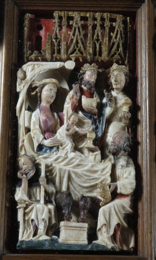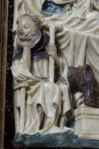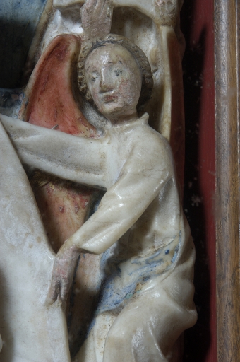 - albâtre, décor dans la masse, décor en demi relief, peint, polychrome