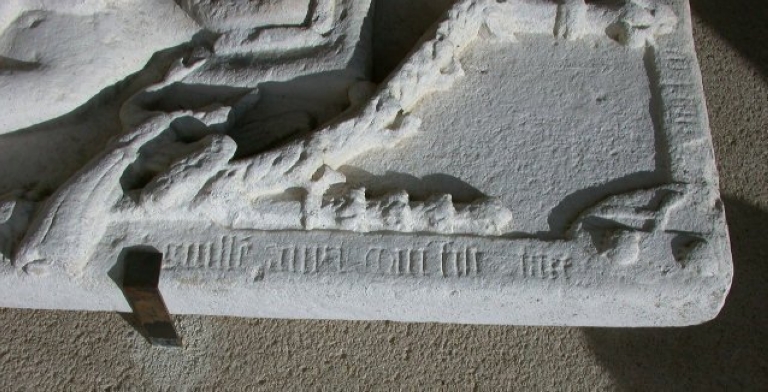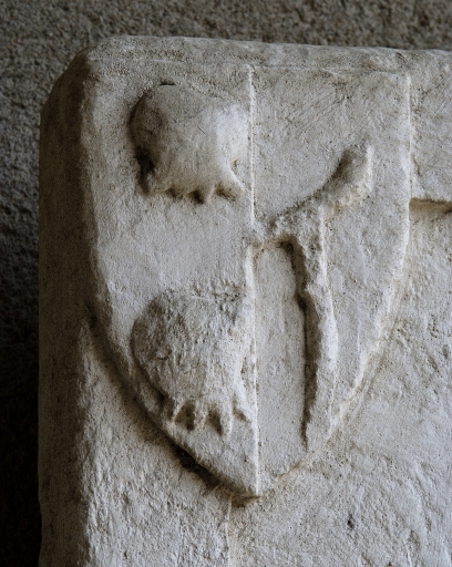 Une inscription gravée en lettres gothiques - non déchiffrée - court sur les bords de la dalle. Deux écus portant des armoiries non identifiées en miroir dans les angles supérieurs.