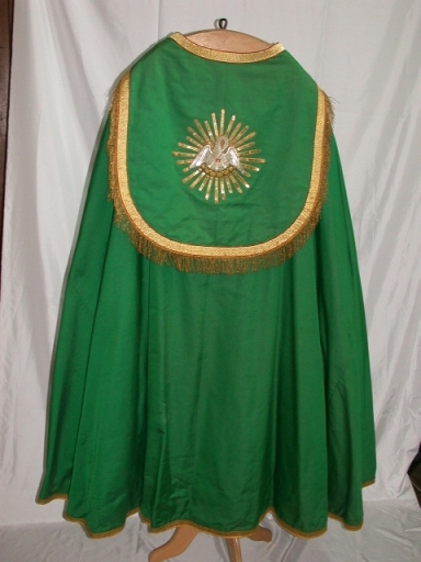 Chape verte : coton (vert) : satin, application sur textile, adjonction d´éléments ; fil métal : doré, argenté. Oeuvre déposée. Limite 19e siècle 20e siècle. Représentation : Pélican mystique ; rayon. Fig. 38.