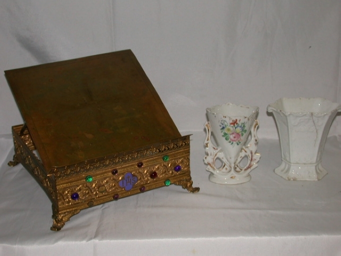 Pupitre d´autel : métal : fondu, doré, émail ; verre transparent (coloré) : taillé en cabochon ; 31 Pr. 4e quart 19e siècle. Représentation : croix, rayons, IHS, ornementation végétale. Fig. 17.