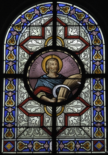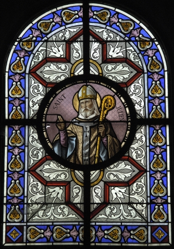 Verrière 3, signature et date : LECOMTE ET COLIN RENNES 1890. Verrière 11, inscription : DON DE EMMANUEL GOUGEON.Verrière 12, inscription : DON DE LOUIS BOURDON. Verrière 7, inscription : SAINT ISIDORE, signature et date dans les angles inférieurs : LECOMTE & COLIN / RENNES 1889. Verrière 8, inscription : SAINT JULIEN.