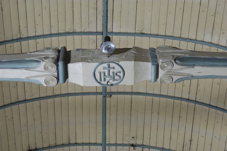 Décor de charpente du 17e siècle. La poutre de gloire est encore en place avec son renflement central sur lequel sont gravées les initiales IHS.