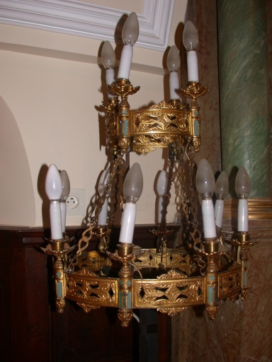 Les luminaires ont été électrifiés. Les lustres ont été montés sur un pied. L'ensemble a été verni. Un luminaire d'applique est déposé.