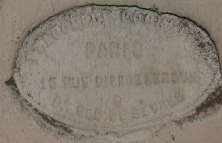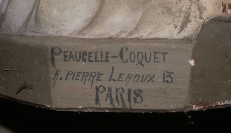 Marque ovale en creux sur la plinthe à l'arrière : PEAUCELLE-COQUET / PARIS. Marque peinte sur la plinthe : PEAUCELLE-COQUET / PARIS.
