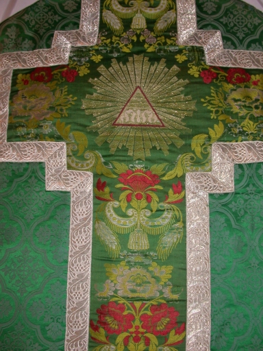 La croix d'une chasuble du milieu du 19e siècle a été remontée sur une chasuble de la limite des 19e-20e siècles.
