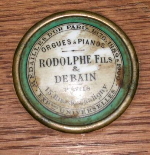 Marque ronde en porcelaine émaillée : ORGUES & PIANOS / RODOLPHE FILS / & / DEBAINS / PARIS / 15 rue de Chaligny / MEDAILLES D'OR PARIS 1878-1889 et 1900 / EXPons UNIVERSELLES.