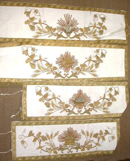 Ornement doré : Chasuble, étole, manipule, voile de calice : soie (jaune) : drap d´or, application sur textile, adjonction d´éléments ; fil métal : doré. Oeuvre déposée ; trace de moisissure ; le devant est un peu usé ; il manque la bourse de corporal. 1er quart 20e siècle. Représentation : chrisme ; quadrilobe ; ornementation végétale. Fig. 19.