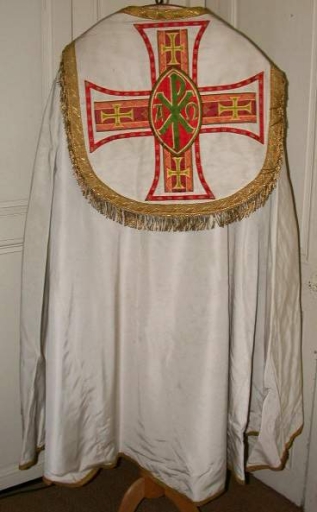 Chape 2 : soie (blanche) : faille française, application sur textile, adjonction d´éléments ; fil métal : doré. Oeuvre déposée ; on a adapté un décor postérieur (vers 1920-30) sur le chaperon. Limite 19e siècle 20e siècle. Représentation : chrisme ; croix. Fig. 15.