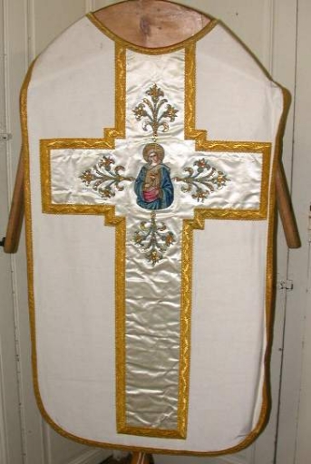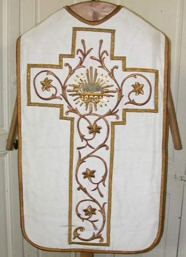 Ornement blanc 4 : Chasuble : soie (blanche) : tissu façonné, satin, application sur textile, adjonction d´éléments ; fil métal : doré. Oeuvre déposée ; importante moisissure ; le satin est un peu usé ; il manque la bourse de corporal, l´étole, le manipule et le voile de calice. 1er quart 20e siècle. Représentation : Notre-Dame du Sacré-Coeur ; fleurons. Fig. 17.