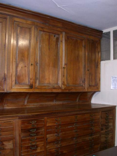 Chasublier, 5 Armoires de sacristie : bois fruitier : mouluré, verni ; laiton : fondu. Vermoulure importante dans la partie inférieure et médiane et sur une des portes ; les tiroirs du bas sont affaissés. Milieu 19e siècle. Fig. 5.