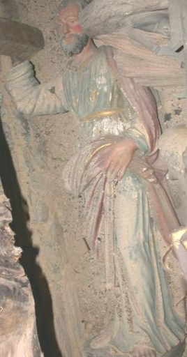 Statue : Saint Pierre : plâtre : moulé, peint, polychrome, peint doré ; 135 h. Oeuvre déposée ; la main droite a disparu. Limite 19e siècle 20e siècle. Fig. 29.