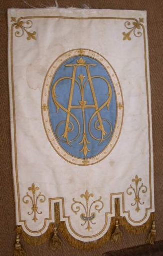 Bannière de procession : Immaculée Conception : soie (blanche) : faille française, moirée, brodée, polychrome, application sur textile, adjonction d´éléments ; fil métal : doré, argenté ; textile (support) : peint, polychrome. 149 h. Oeuvre déposée ; le tissu de fond est très usé, parfois lacunaire. Limite 19e siècle 20e siècle. Représentation : AM ; mandorle. Fig. 10, 11.