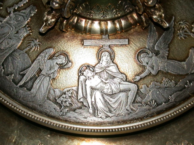 Les poinçons sont sur la coupe et sur le pied. Inscription gravée sur une plaque métallique sous le pied : J. D. / Souvenir de ma Première Messe / 18 juin / 1905. Dans la boîte, marque imprimée en doré sur une étiquette : L. VAUGEOIS / RENNES. Initiales J D gravées sur une plaque de métal, sur le couvercle.