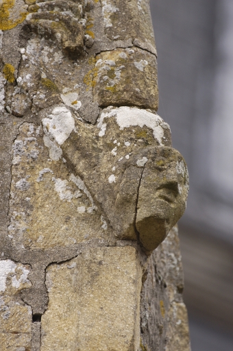 Sur le pinacle est, un personnage tient un écu portant les armes de la famille de Broon : d'azur à la croix frettée de gueules.