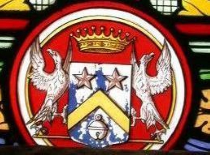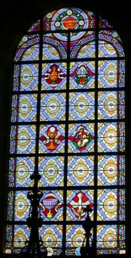 Les armoiries du cardinal et du pape sont situées dans la partie supérieure de la verrière ; les signature et date sont inscrites dans les angles inférieurs, les inscriptions concernant les donateurs, et les autres armoiries sont au milieu, au même niveau. Baie 5 : E. / RATHOUIS // MR. / JEAN / BESCHU // 1874. Baie 6 : CARMEL // M. / V. MICHEL / MALHERRE // LE / MANS. Baie 7 : armoiries de Mgr Brossay Saint-Marc // E. / RATHOUIS // Mr et Me / PROSPER VIVIEN // armoiries : de gueules à la barre d´or / lettres RM et FB // 1874. Baie 8 : armoiries de Pie IX // Mr et Me / H. R. du COURTIL DE FOURNAUX / armoiries de la famille Courtil : d´azur au chevron d´or accompagné de deux étoiles et un grelot d´argent ; couronne comtale ; portant : deux aigles // LE / MANS. Baie 9 : CARMEL // Mr : ORHANT // J.B.O. // LE MANS. Baie 10 : E. / RATHOUIS // P. A. // M. et M. RENE MALHERRE // Restauration / 1989 / RAULT. Baie 13 : MME VVE / BLANCHARD / ET / SON FILS. Baie 14 : M. ANDRE / BRASSIER / 1874. Baie 00 : J.B. // armoiries de Bretagne // F.L.