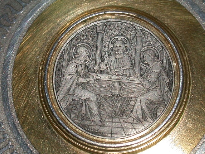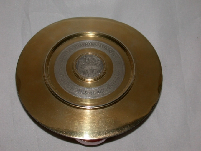 Les poinçons sont sur le pied, la coupe et la patène. Inscription : CUI : MANDUCAT : HUNC : PANEM/VIVET/IN : AETERNUM.