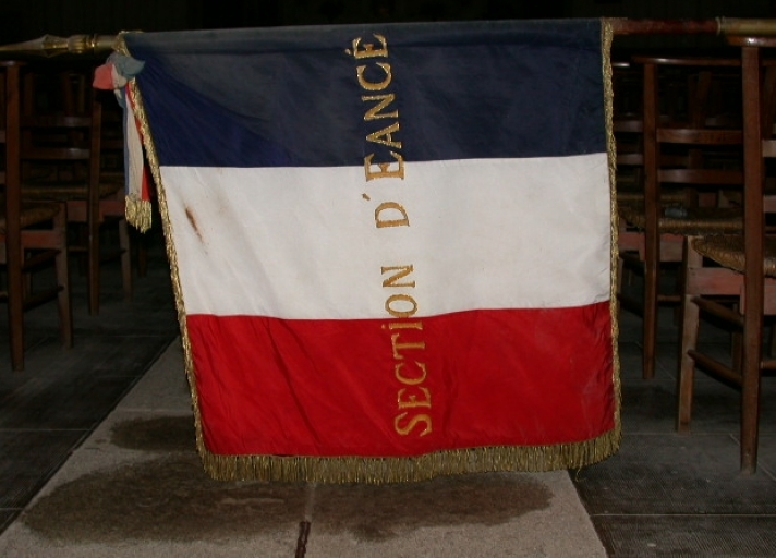 Le tissu du fond a été remplacé. Les lettres de l'ancien drapeau ont été recousues.