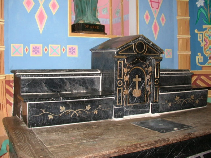 Monogramme : A M J [Anne, Marie, Jésus] gravé et peint en doré sur le devant d'autel.