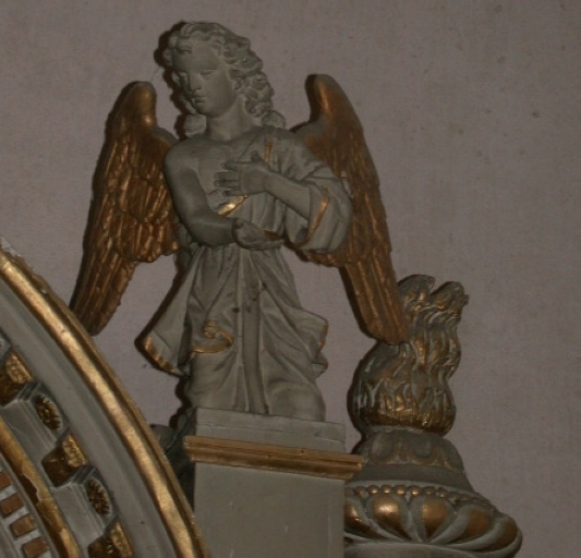Retable composé d'une niche centrale accostée de deux colonnes que surmontent deux anges à genoux. De chaque côté de l'autel, est une porte surmontée d'un fronton triangulaire orné d'un pot de fleurs, puis d'un panneau cruciforme entre des retombées de fruits. Le tout est sommé d'un fronton curviligne que surmonte un vase chargé de fruits.