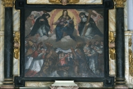 Tableau copié d'une oeuvre de Rubens, La Descente de Croix, peinte en 1611-12. La scène est inversée par rapport à l'original et élargie grâce à l'adjonction, à droite, d'un personnage vêtu en soldat romain et portant un drapeau tricolore.