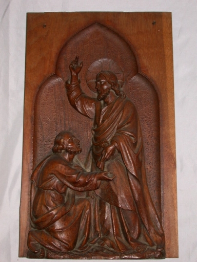 Relief : bois : décor dans la masse, décor en demi relief ; 46 h. oeuvre déposée ; oeuvre démontée ; fragment ; proviendrait de la chaire. 19e siècle. Représentation : Evêque ; saint Jean Baptiste ; le Christ et la Samaritaine ; la remise des clés. Fig. 68, 69, 70, 71.